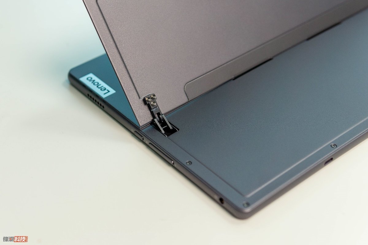 让小新 Duet 能以这样小巧形态支撑在桌面上的,自然就是它的铰链了。这款铰链采用了跟此前 Yoga Duet 上的几乎与一样的设计,阻尼感非常到位,整体还是比较稳固的,上手触控的时候不会像一些支持触控的笔记本一样随手指的动作疯狂震颤。