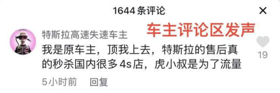 即便是特斯拉车主出来解释,“特斯拉的售后真的秒杀国内很多4S店,虎小叔是为了流量。”