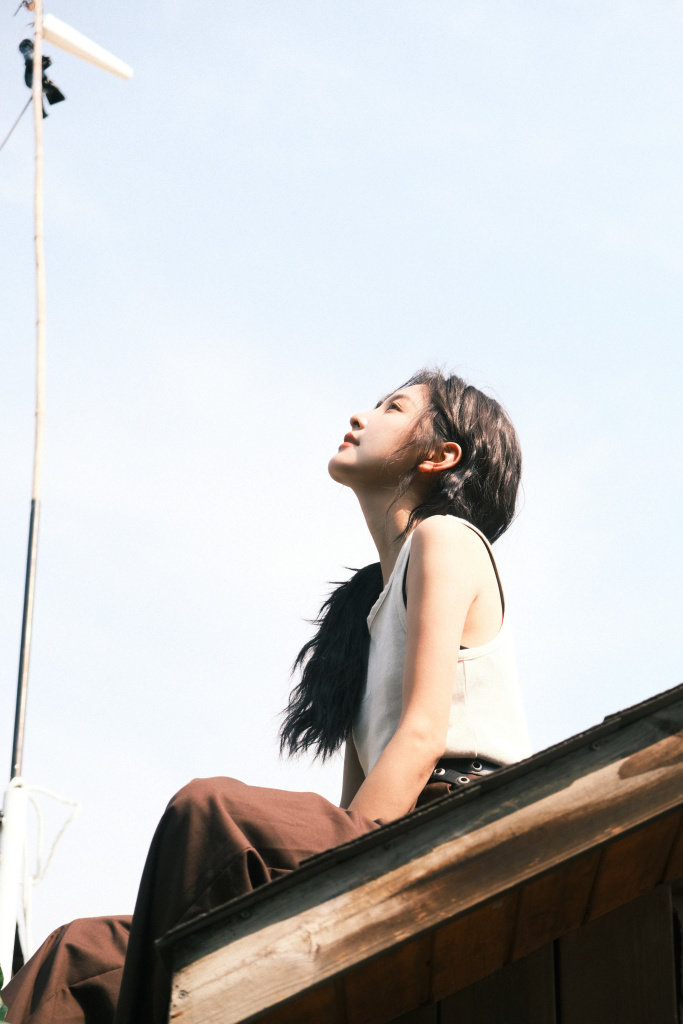 2022年8月29日,章若楠分享绿野氛围感大片,扎斜边马尾变身田园少女。