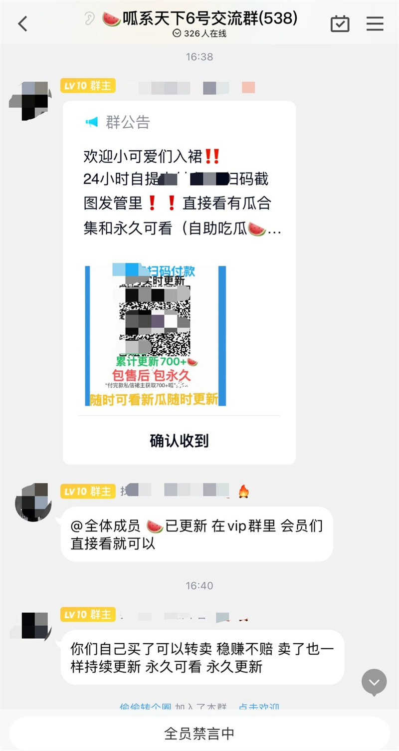 另外记者发现,为了吸引人购买,有博主表示,付款后拿到的链接,购买者也可以用这个继续赚钱。“你们自己买了也可以转卖,稳赚不赔。”“VIP群内容主要为平时朋友圈、微信群疯传的各种聊天记录。”“短视频等平台疯传热门瓜以及网红瓜、娱乐圈瓜。”记者注意到,当群内有新成员加入的时候,群主会继续发消息,让成员尽快付费“吃瓜”。记者在发稿前,已向平台反映了相关情况。
