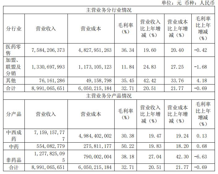 具体来看,医药零售业务实现营收75.84亿元,同比增长19.6%;毛利率36.34%,同比减少0.42%。加盟、联盟及分销业务实现营收13.3亿元,同比增长24.83%;毛利率11.84%,同比减少1.68%。其他业务实现营收7616万元,同比增长42.42%;毛利率35.45%,同比增长4.18%。