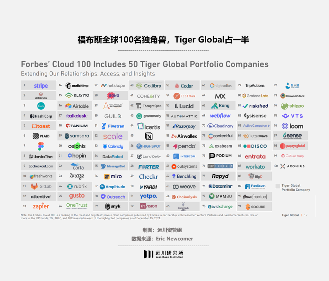 福布斯全球100名独角兽,Tiger Global占了一半.Eric Newcomer