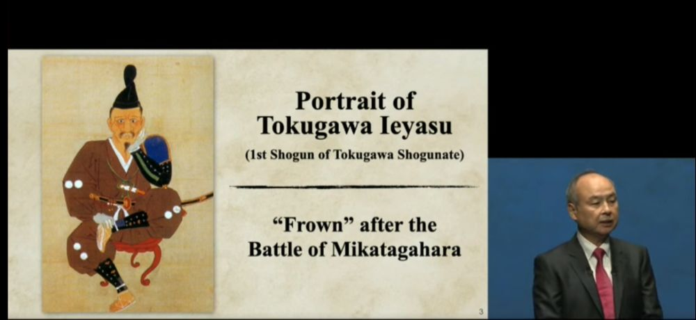 孙正义以古怪的演讲风格闻名,他在新闻发布会上展示了德川家康的插图,称在惨败后,就感觉自己像是德川幕府的第一代将军。