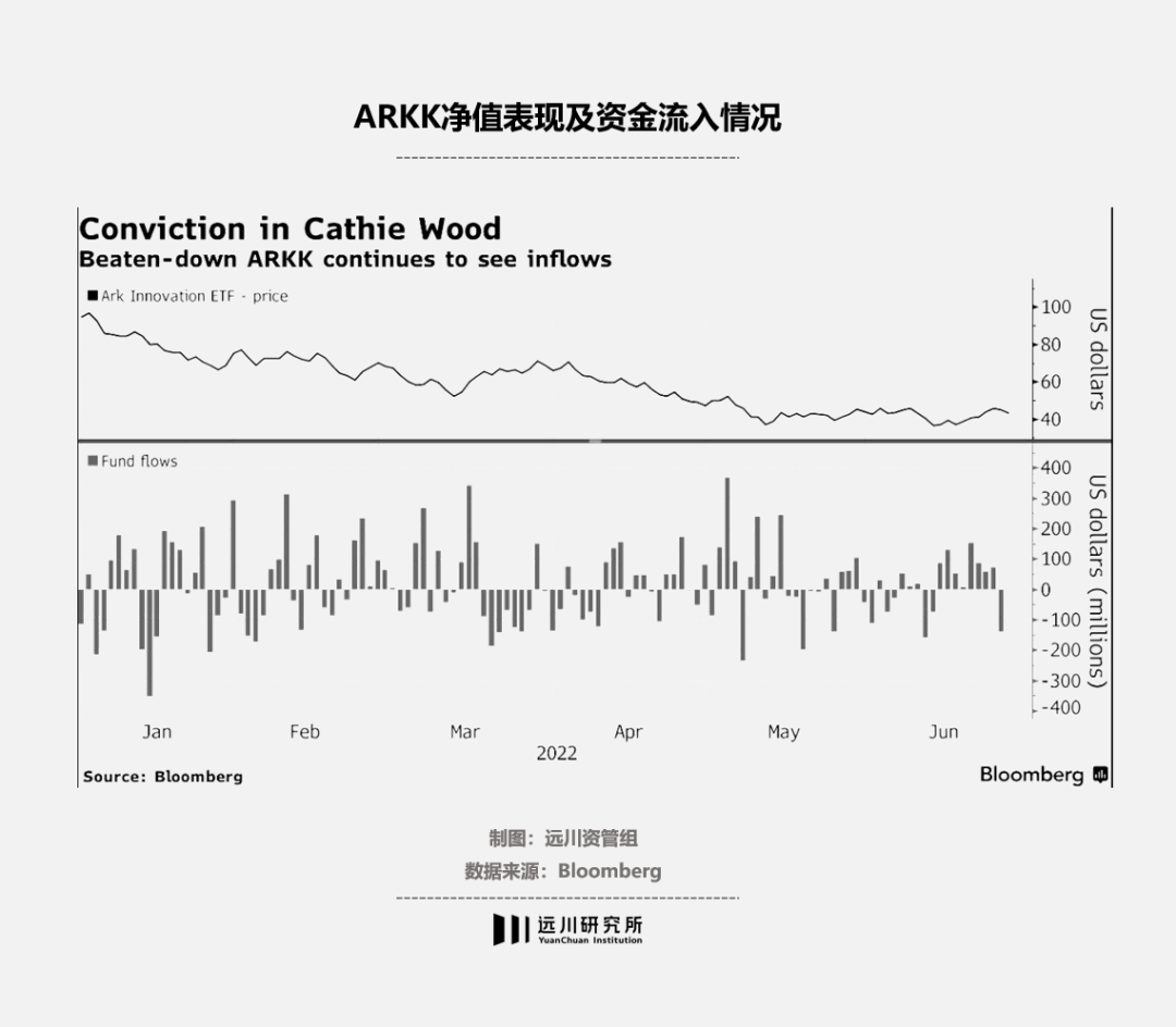 不过从骂声中也可以看出,市场上依旧有不少人仍把木头姐看做“女版巴菲特”,宛如前赴后继抄底诺安的基民:无论ARKK怎么跌,都有资金涌入方舟投资。
