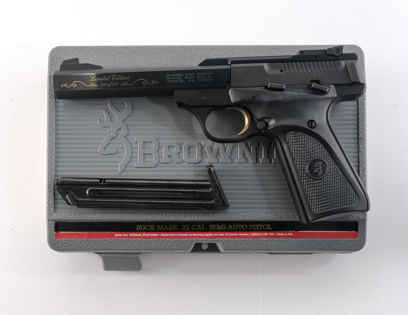 巴克马克手枪的原型枪,实际是六十年代该公司设计的挑战者手枪,八十年代勃朗宁公司对挑战者手枪进行重新设计,诞生了新的巴克马克手枪。当时的手枪大多都是全钢制成的,而巴克马克换成了铝合金材质,将非常重的扳机换成了更加轻量的扳机。