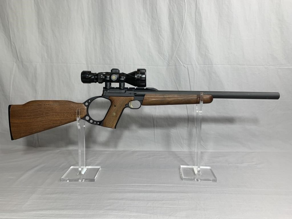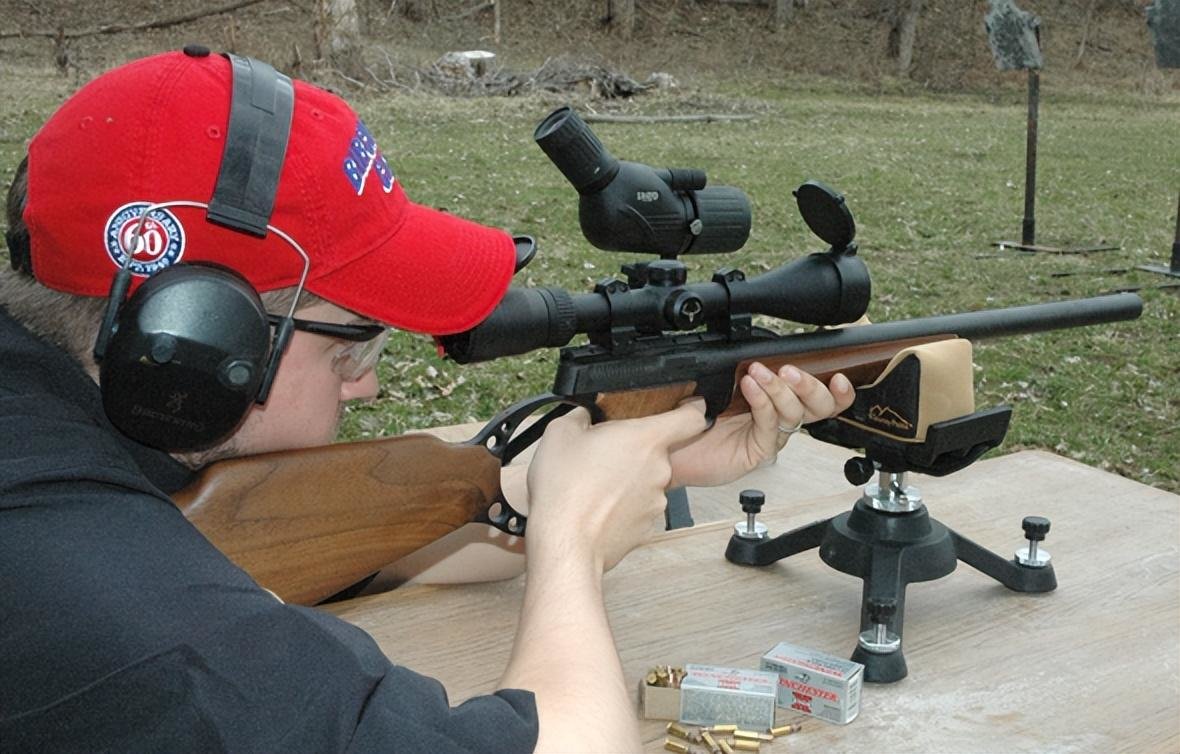 除了巴克马克手枪型号之外,实际上还有几款步枪型号。步枪型实际上就是将巴克马克手枪的枪管加长到步枪枪管长度,18英寸的枪管,并且在枪的后方加了一个部分镂空的枪托,顶部加上导轨,便于加装瞄具。整体来看,其实就像是一个长管手枪,并且没有特意加装拉机柄,还是原来的上膛方式。