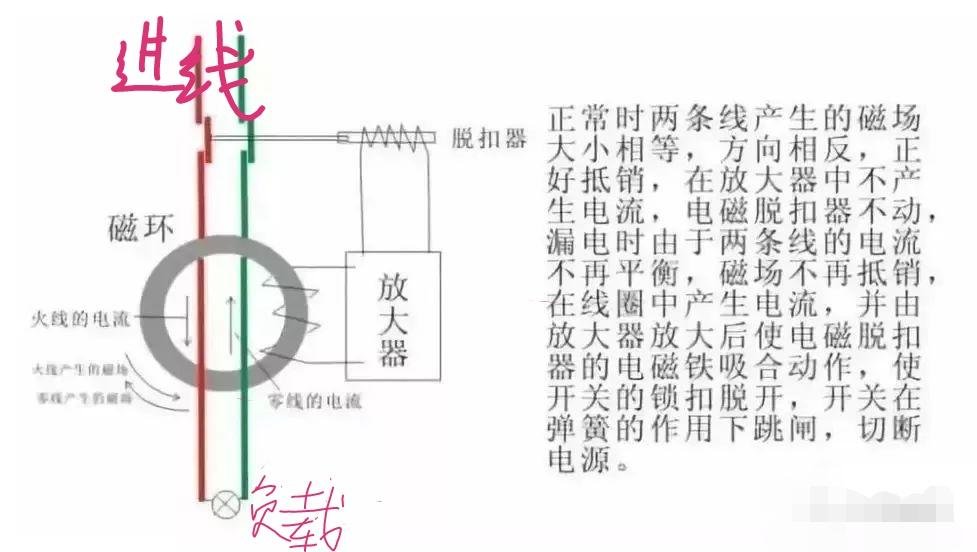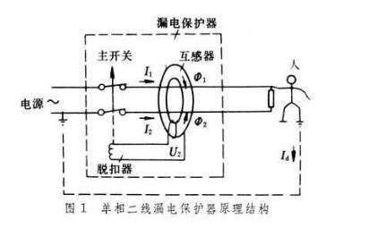 漏电开关主要有零序互感器、放大器、脱口器等。被保护的火线和中性线穿过环行铁心,构成了互感器的一次线圈N1,缠绕在铁心上的绕组构成了互感器的二次绕组N2。如果没有漏电情况发生,这时流过相线和中性线的电流向量和等于零,因此在N2上不能产生感应电动势,开关也就不会跳闸。如果发生漏电时,相线和中性线的电流向量和不等于零使N2上产生感应电动势,这个信号传给放大器,由放大器放大后使电磁脱扣器的电磁铁吸合动作,使开关的锁扣脱开,开关主触头断开切断电源。