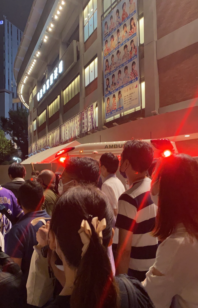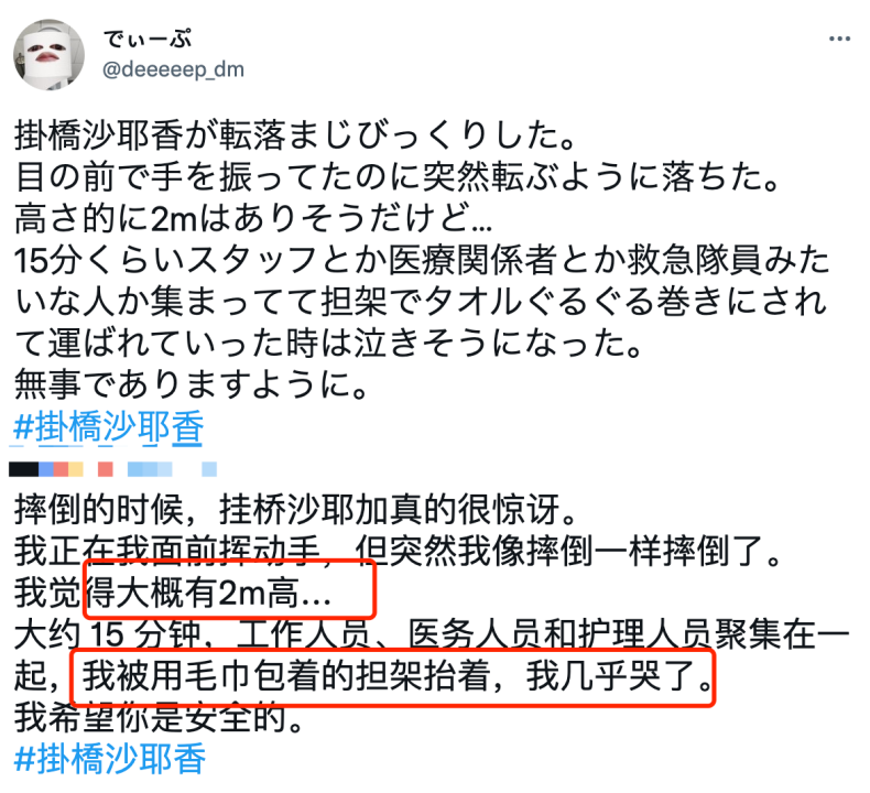 挂桥沙耶香跌下舞台后,现场尖叫声一片,粉丝因为惊恐纷纷大喊着。与此同时,工作人员马上前往事发地,15分钟后医护人员和消防人员也抬着担架赶到女方摔跤处,并用毛巾将她抬出场外,紧急送往医院医治。