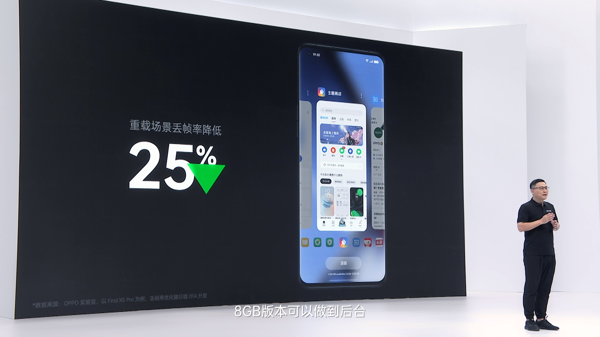 其他功能上,OPPO也为我们展示了OPPO自研系统级计算中枢「ColorOS超算平台」最新成果,全新算法在提升性能、续航的同时,还让升级到ColorOS 13的OPPO Find X5 Pro,能以8GB内存同开18个应用,重载场景丢帧率至少降低25%,并且后续会普及到其他机型。