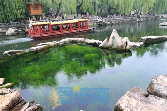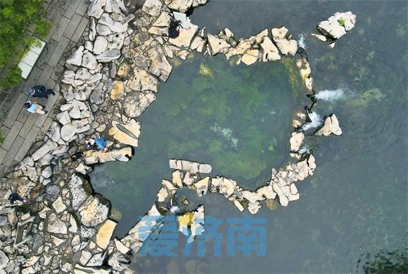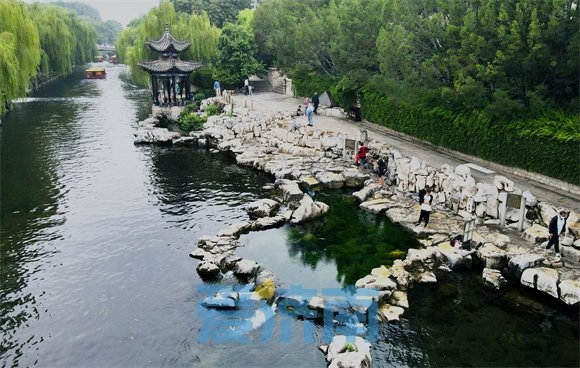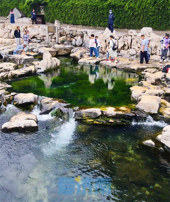 时下正值盛水时节,串串水泡争相上涌浮出,漾溢着涟漪,与水中蒲藻白石相乱,汩汩清泉流入护城河,演绎着醉人的泉水交响乐。