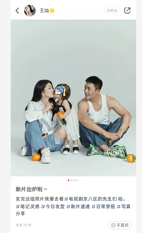 8月31日,杜淳娇妻王灿在个人社交平台分享了一组一家三口合体拍摄的全家福写真,她还在线给老公的新剧打call,十足的宣传小能手。