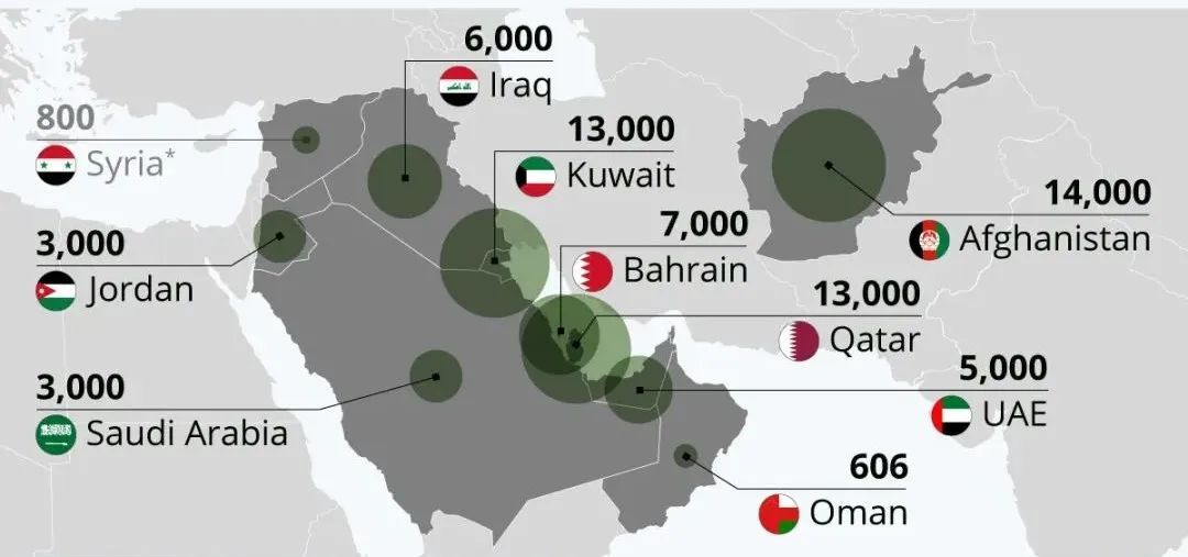 ▲ 美国在中东的主要军事力量分布(截止2020年1月)。图源:statistia
