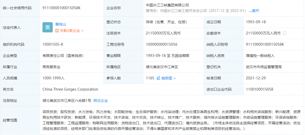 三峡集团指中国长江三峡集团有限公司, 1993年9月27日经国务院批准,中国长江三峡工程开发总公司正式成立;2017年12月28日,完成公司制改制,由全民所有制企业变更为国有独资公司,名称变更为中国长江三峡集团有限公司(以下简称三峡集团)。历经近30年持续快速高质量发展,三峡集团现已成为全球最大的水电开发运营企业和中国最大的清洁能源集团。