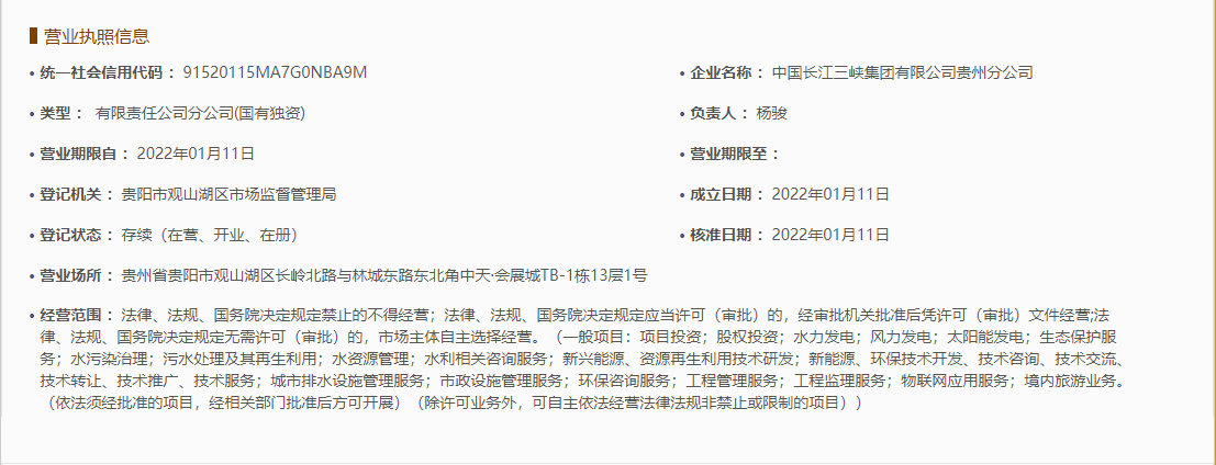 2022年01月11日,三峡集团在贵阳观山湖区注册成立中国长江三峡集团有限公司贵州分公司,并于8月份与贵阳城投集团开展工作座谈,就合作内容和方式进行了深入交流探讨。