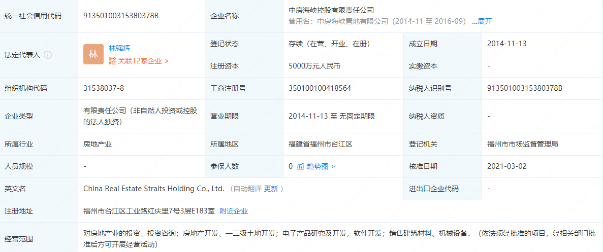 据企查查信息,中房海峡指中房海峡控股有限责任公司,隶属于中国蓝田集团,成立于2014-11-13,法定代表人为林强辉,注册资本为5000万元人民币,总部位于福州市。所属行业为房地产业,经营范围包含对房地产业的投资、投资咨询;房地产开发、一二级土地开发;电子产品研究及开发,软件开发;销售建筑材料、机械设备。