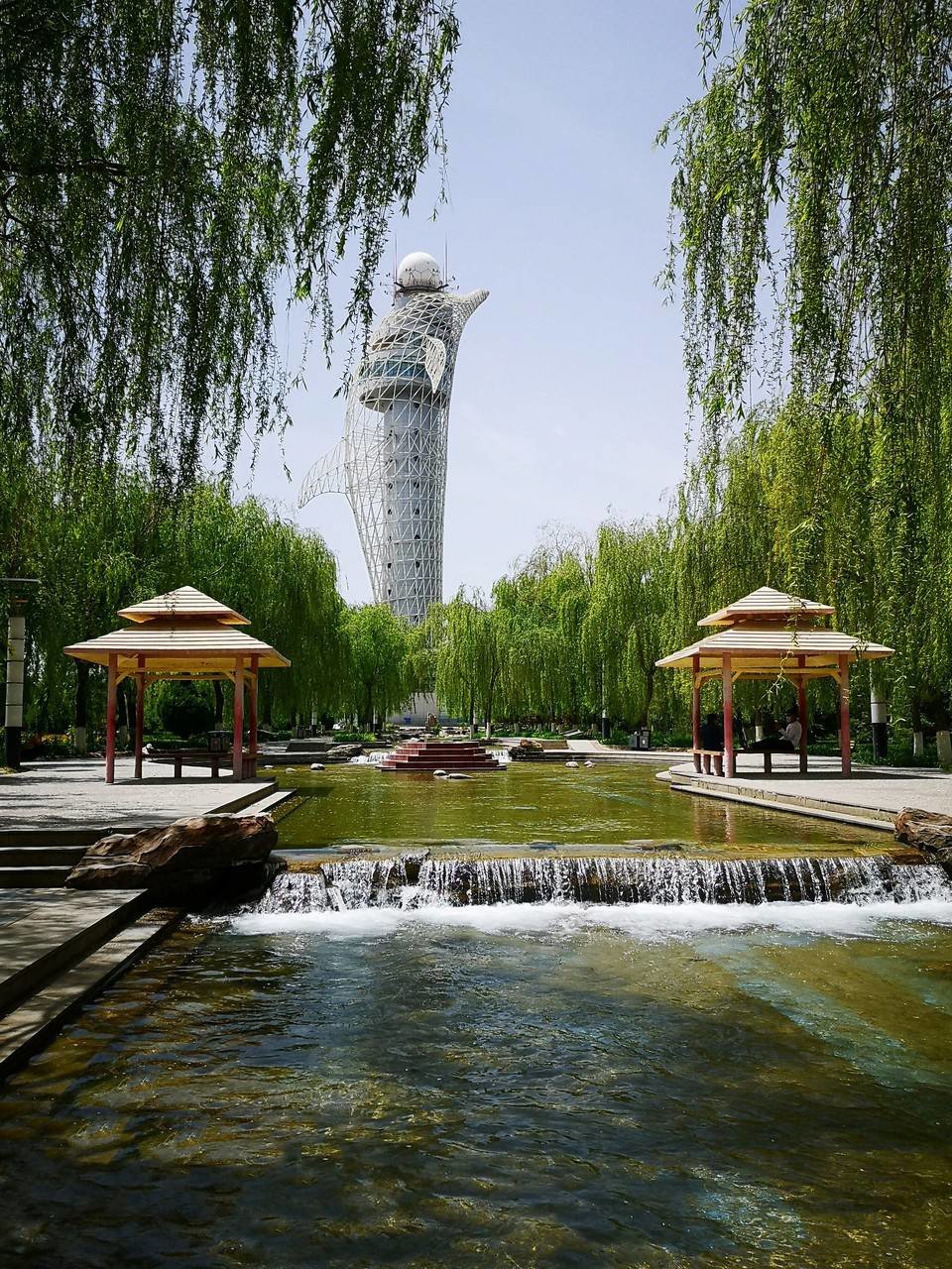 东湖的水来自祁连山,炎炎夏日,冰凉的雪水带着高山的寒气涌入东湖中,为嘉峪关带来丝丝凉意。公园中的碧海明珠气象塔宛如一只从湖中高高跃起的海豚,它是全国最高的气象塔,爬到塔顶可以看见无边的戈壁和巍峨的雪山。