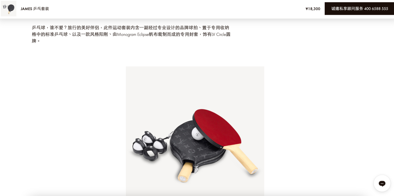乒乓套装属于LV生活艺术中的运动用品。红星资本局注意到,这一系列中,还有价值6250元的跳绳、1.87万元的足球、1.92万元的哑铃、2.62万元的滑板等。