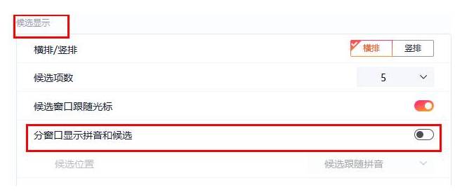 4、下拉界面即可看到“候选显示”,然后打开“分窗口显示拼音和候选”后的开关即可。