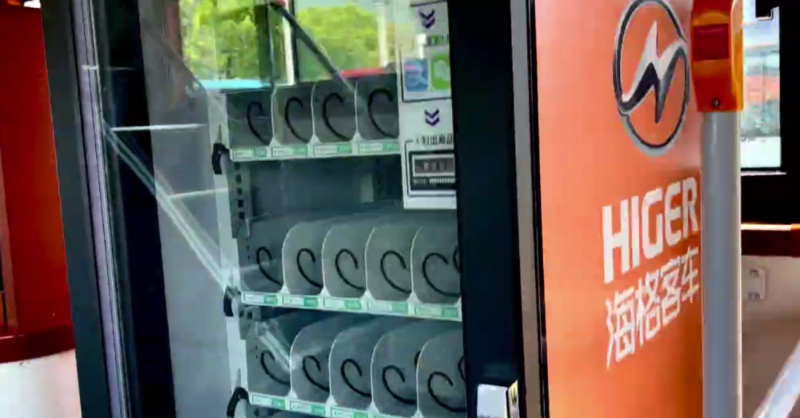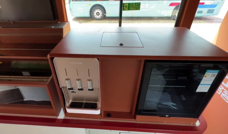 贴合城市旅游观光巴士特点,海格客车在一层前部特别设置有城市文化展示橱窗+吧台设计,其中展示柜可以放置当地旅游文化特色产品展示,吸引乘客关注更多城市信息;吧台设计,放置了饮水机带冰箱,同时车辆后部还有自动售货机组合设计,当乘客口渴了可以直接扫码购物,非常便利。