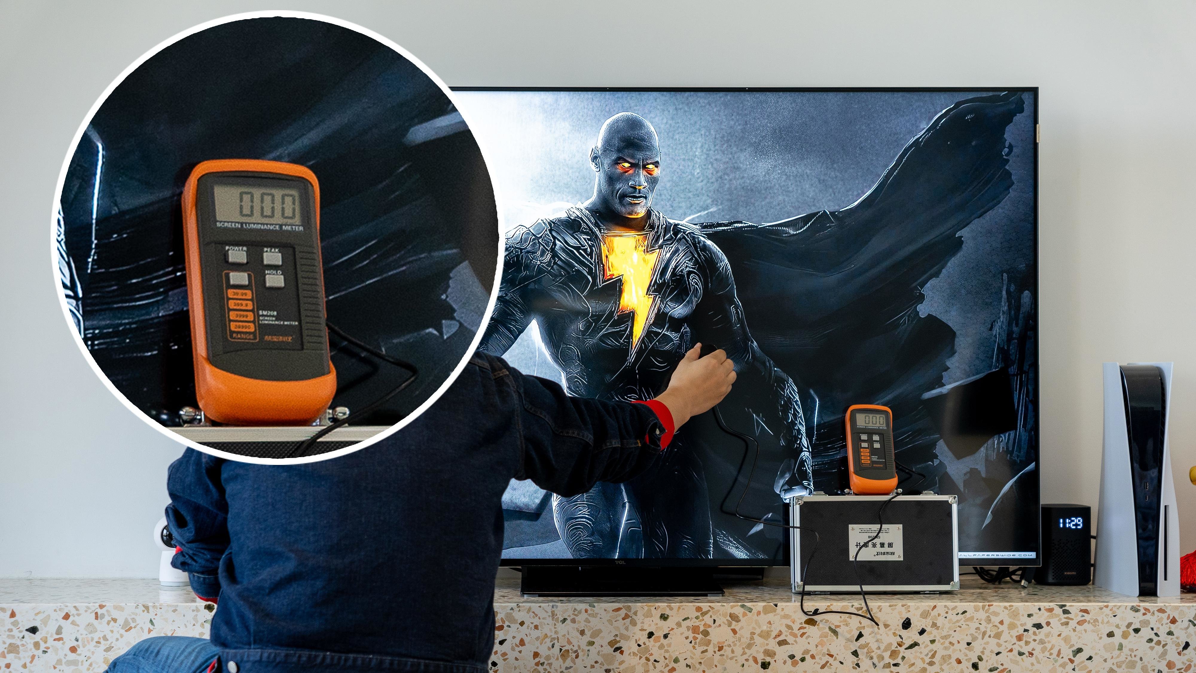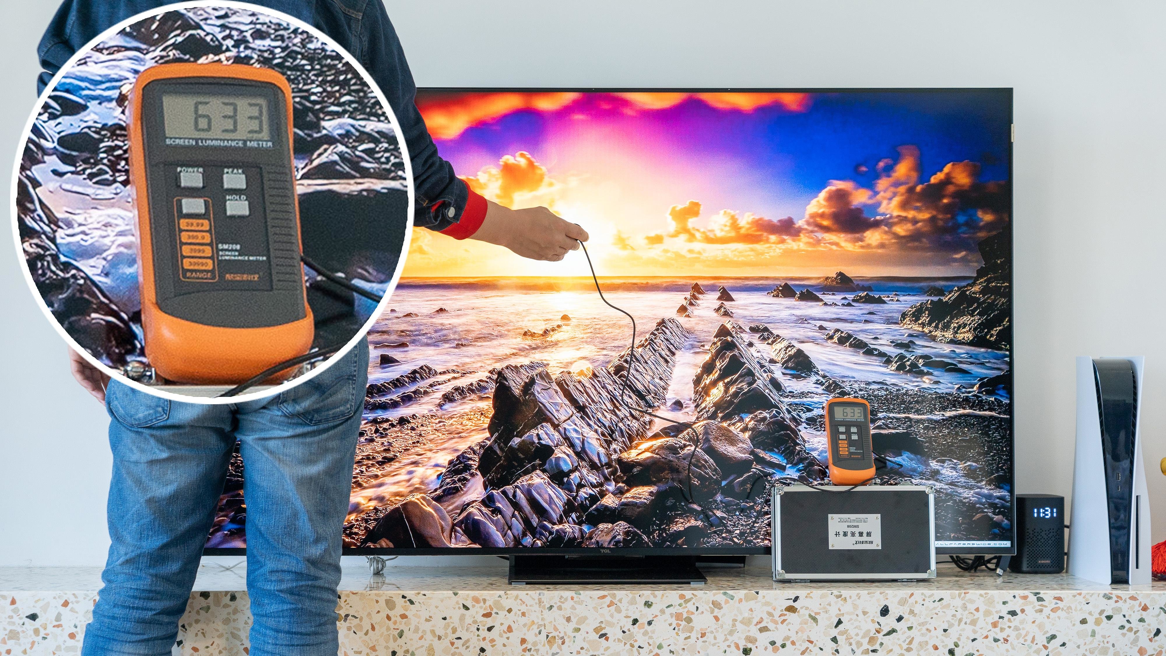 通过亮度仪测试可以看到在这样一张静帧的海报画面,测试画面中心区域亮度为596nit。