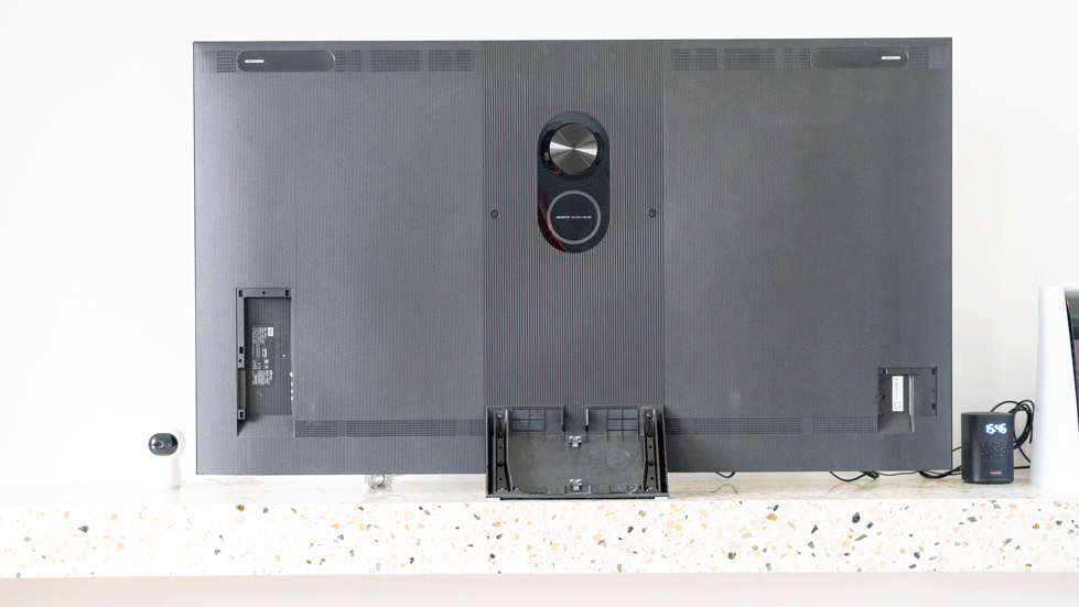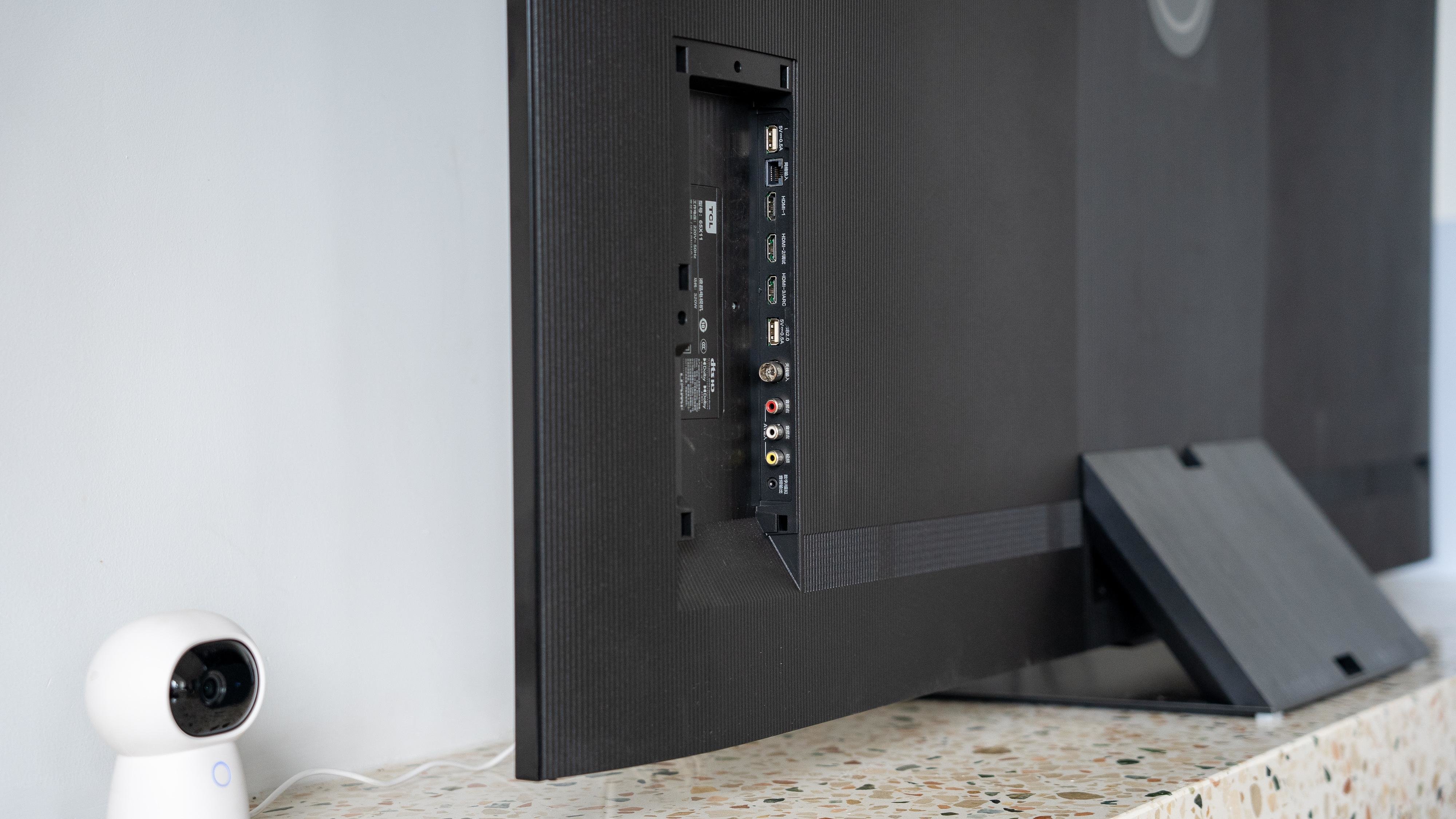 可能电视背面设计很多人不会关注,毕竟一般电视都是靠墙摆放一般我们不会注意到电视背后的设计。但是TCL还是为X11设计了“无书包”设计。这样的设计除了让电视看上去更美观之外,更是为X11配置了5声道7单元60W超高功率的安桥音响。细节部分在理线接口部分也设计了隐藏盖板。而且为了方便走线在电视的悬浮底座上也设计了理线仓方便隐藏线材。