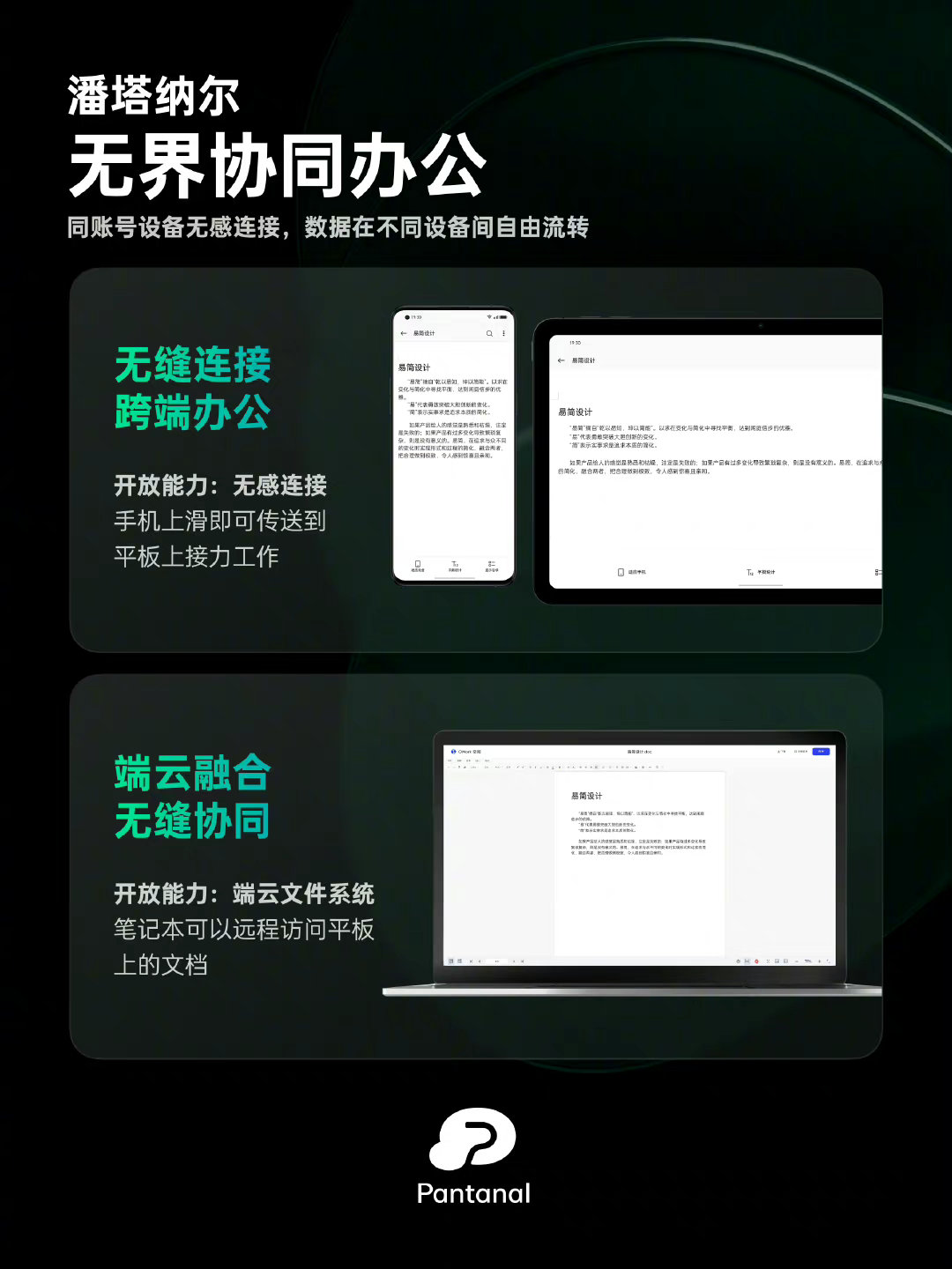 举个例子,其中的无界协同办公就是最直接的体现,这个大家都比较熟悉了,也就是手机、平板、笔记本电脑等多个设备之间,只要是同一个账号就能实现自由流转,无缝协同。比如,手机上滑即可将资料传送到平板上接力工作,家里的平板可以远程访问公司电脑的上的文档,然后跨设备无缝协作办公,让操作变得更高效。