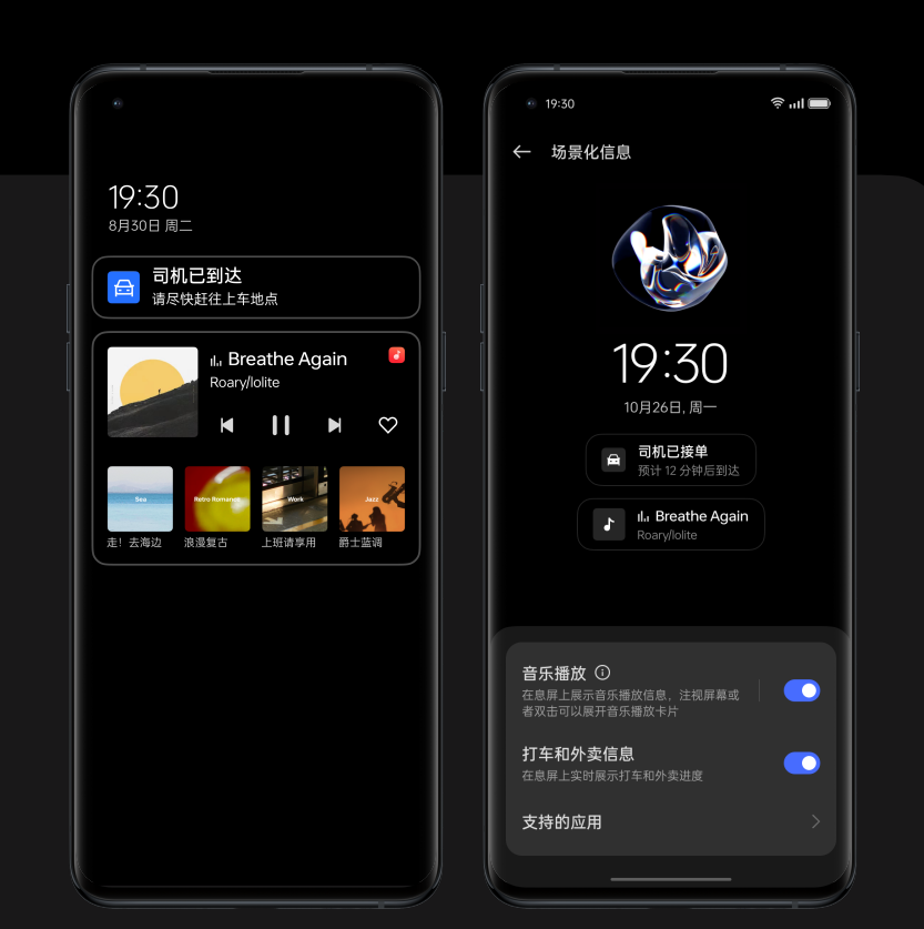 此外,智慧息屏新增了多项功能,支持更多的内容显示,类似外卖信息、打车信息、音乐歌单控制面板、艺术家作品等内容均可实现息屏显示。可以说ColorOS 13是在基于Android 13的新特性基础上,进行了更全面的优化适配。