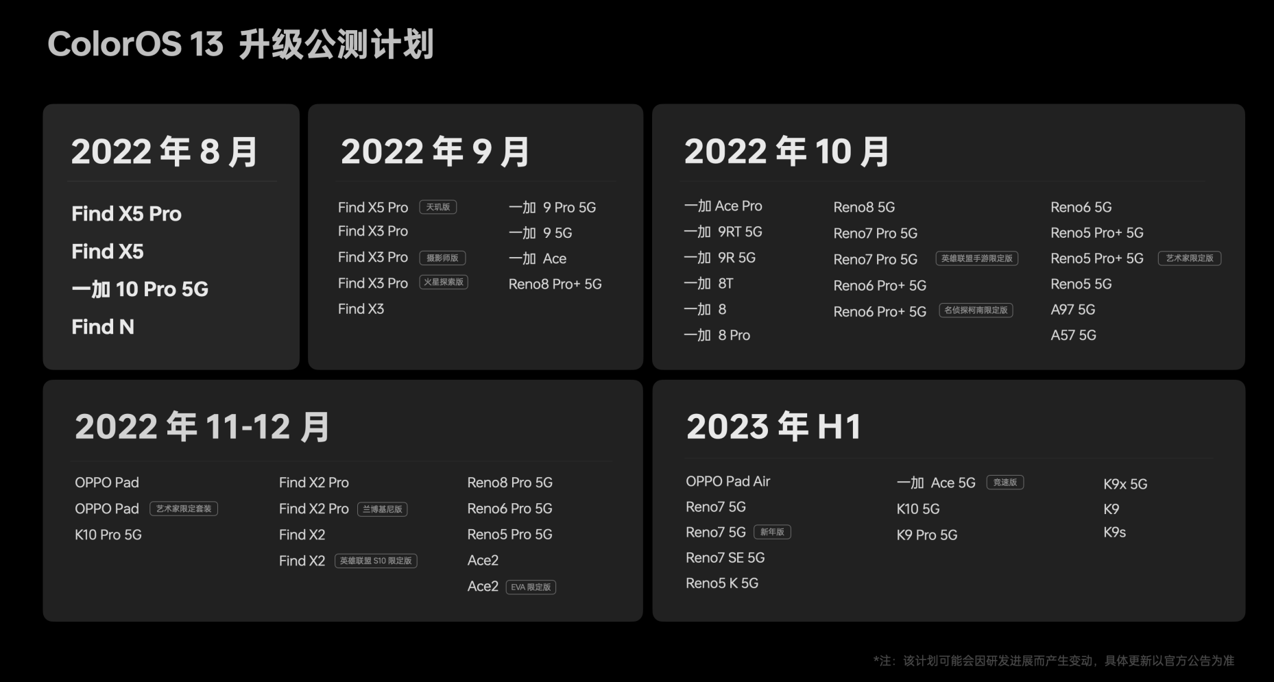 ColorOS 13目前已公布升级公测计划,其中OPPO Find X5系列和一加 10 Pro旗舰机、以及Find N折叠屏这几款机型,已在8月份推送尝鲜升级。紧接着从9月份开始,直至2023年第一节,将会有更多OPPO和一加的机型获得更新。大家可以看看,列表中有你在用的机型吗?