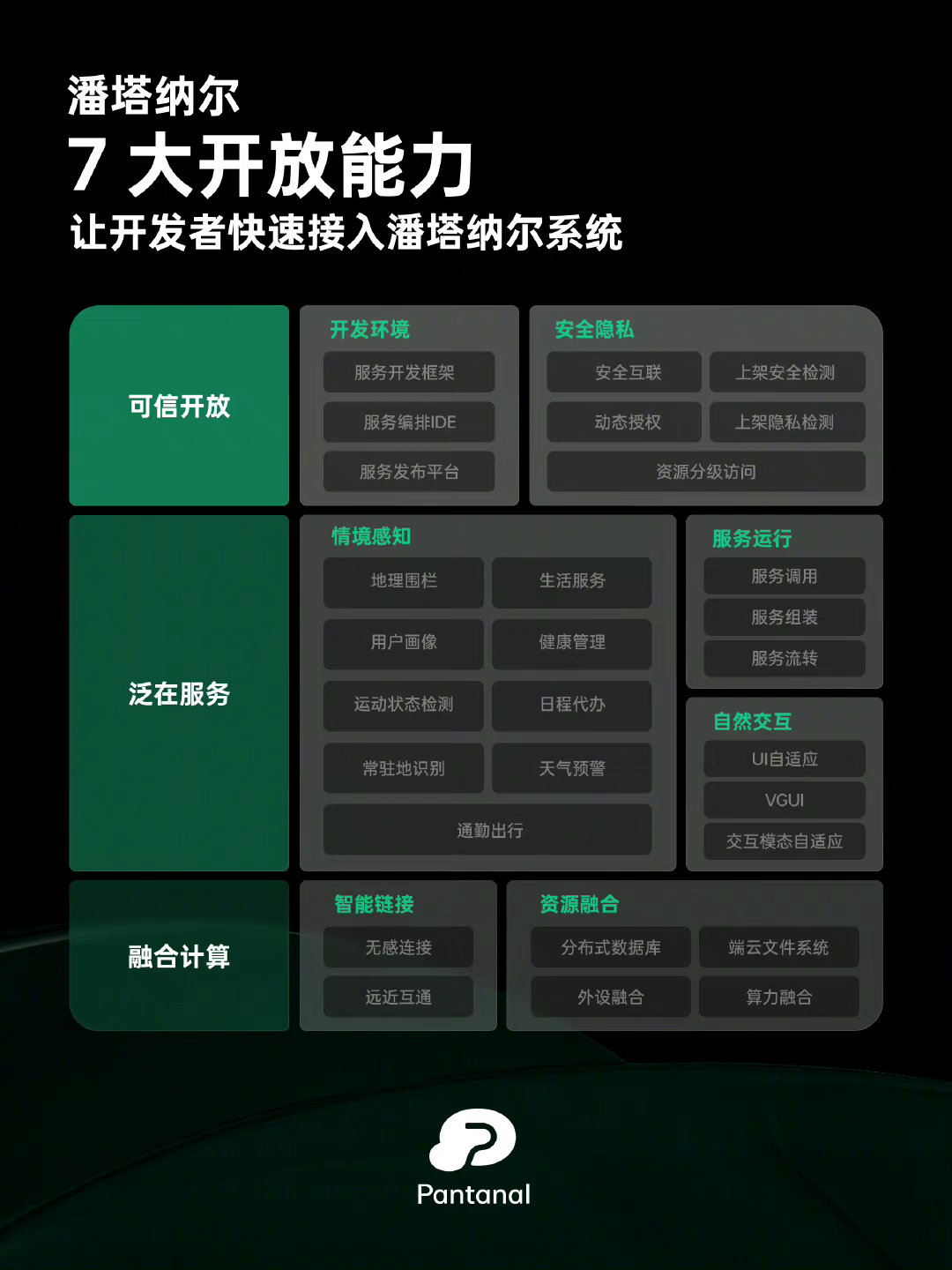 从开发者大会中,我们了解到潘塔纳尔系统设备互联能力大升级,主要得益于融合计算、泛在服务、可信开放三大核心特征。并且随着七大核心能力陆续上线,让开发者快速接入潘塔纳尔系统,来构建更开放、更友好的生态。