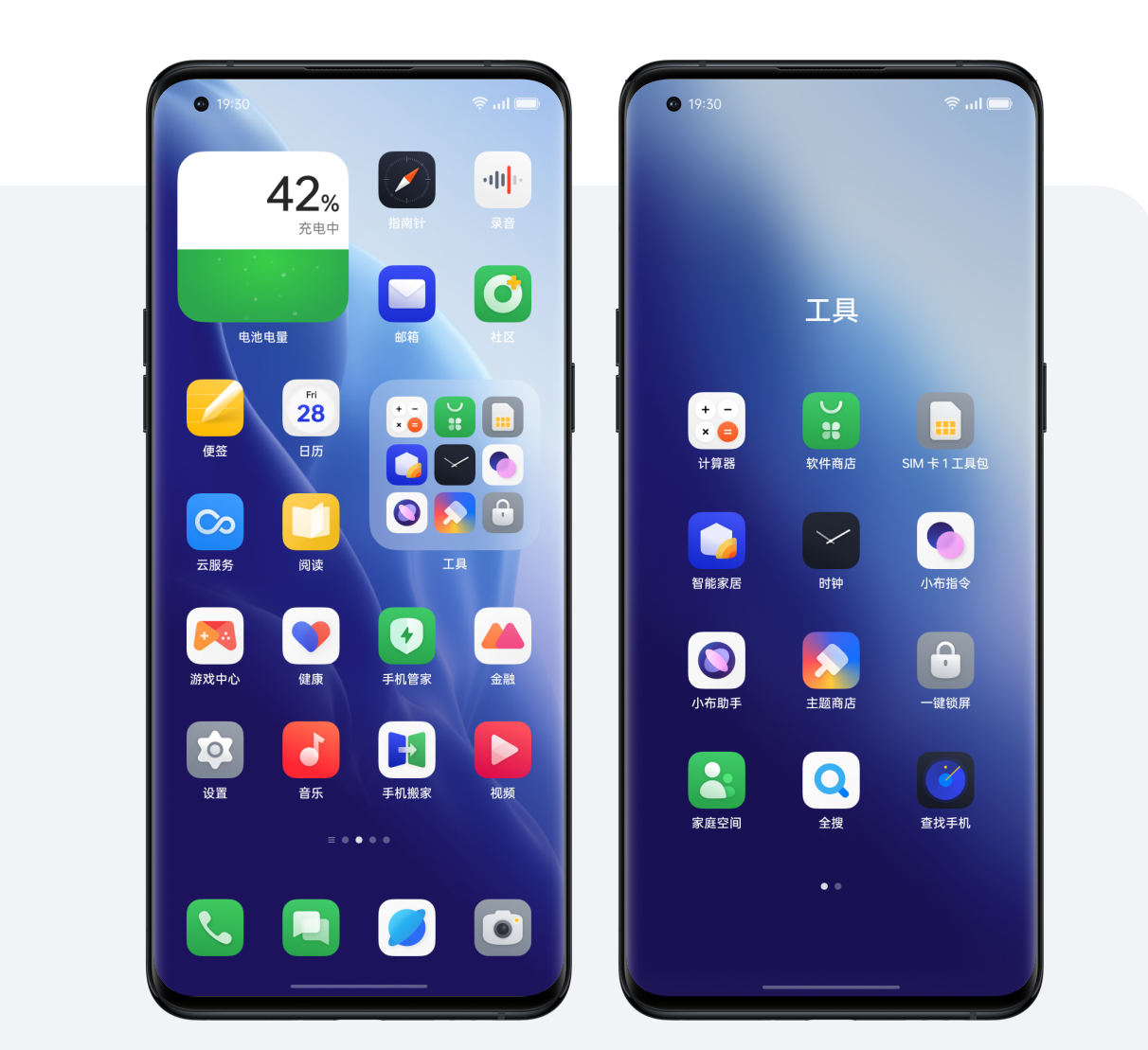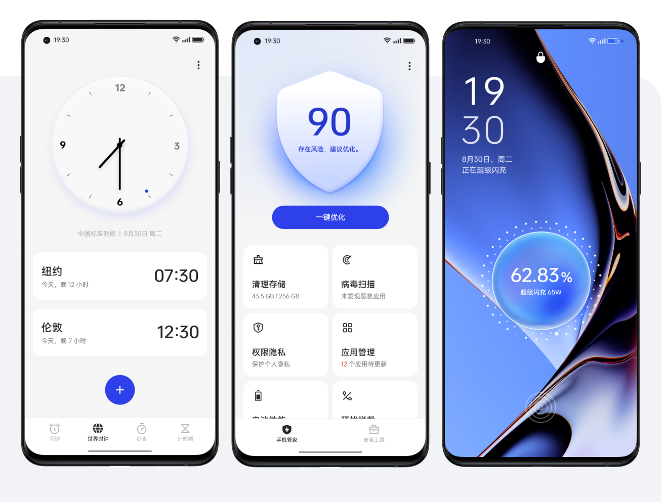 在时钟界面、充电动画、手机管家中,加入了水生动效,同时系统色彩和壁纸,能根据海平面日出到日落24 小时变化,整个系统界面都变得更具高级感。