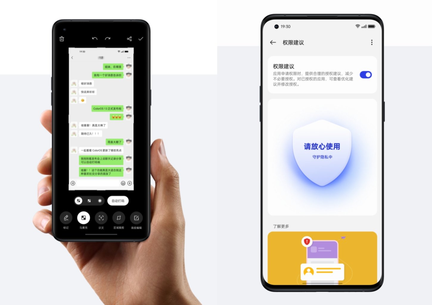 隐私方面进一步升级,ColorOS 13新增截图分享自动打码功能,截图中头像与昵称可实现一键打码,同时还新增智能护盾权限管理等功能,让手机隐私防护可知可控。
