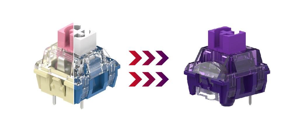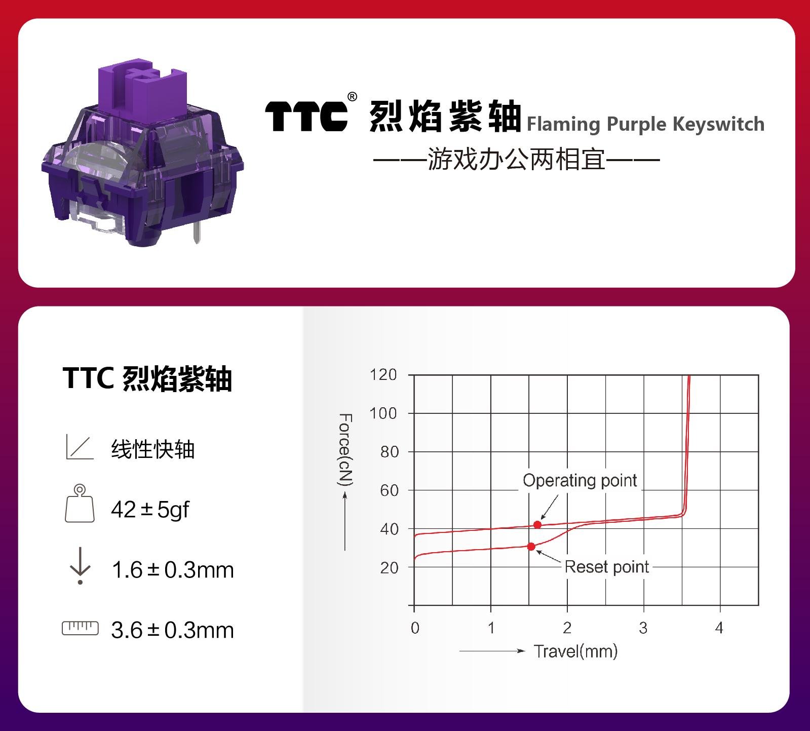 TTC官宣资料显示,烈焰紫轴采用的加长轴芯设计,让轴芯柱先触底,并与底座碰撞产生“哒哒”的声音,来强化确认感,借此来制造下压声音上的差异。另外,轴芯将采用新材料POK,据说它有POM的自润性和韧性,又兼顾UPE的耐磨性和低摩擦,不禁让人好奇它的实际功效。另外,为了提高热插拔时轴体的寿命,动、静片均升级为镀银涂层,提高抗氧化能力以强化耐用性。
