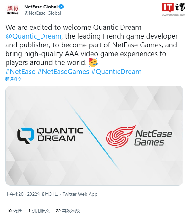 网易几年前已经与 Quantic Dream 建立合作伙伴关系,关于全面收购的传言在今年 3 月下旬流出。