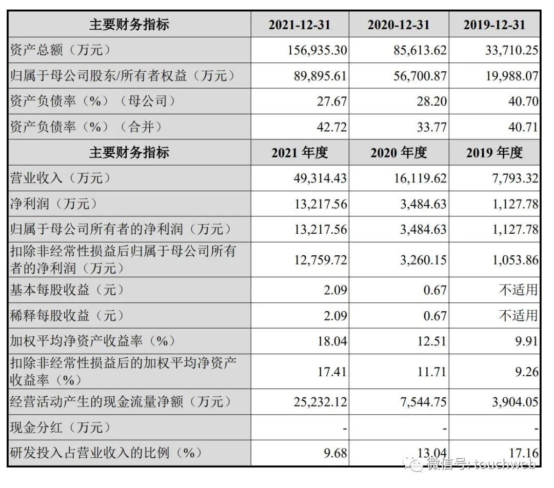 招股书显示,伟测半导体在2019年、2020年、2021年营收分别为7793.3万元、1.6亿、4.93亿;净利分别为1127.78万元、3484.6万元、1.32亿元。
