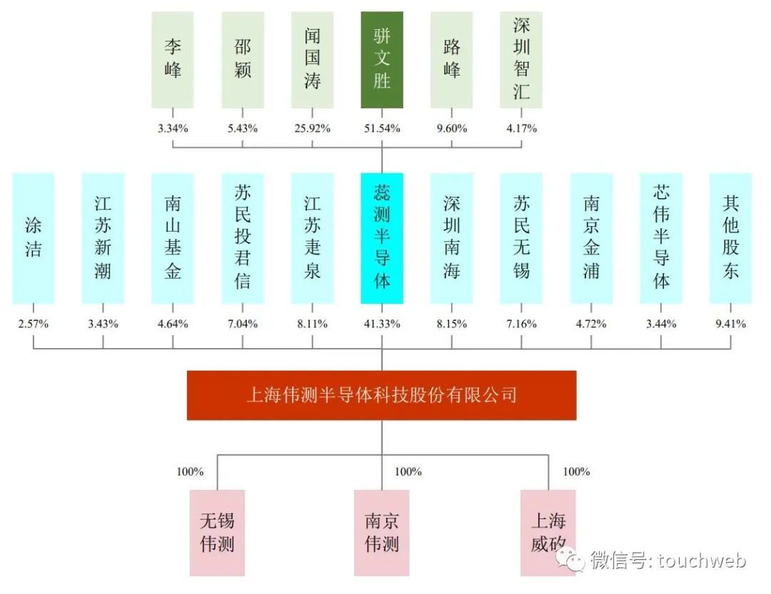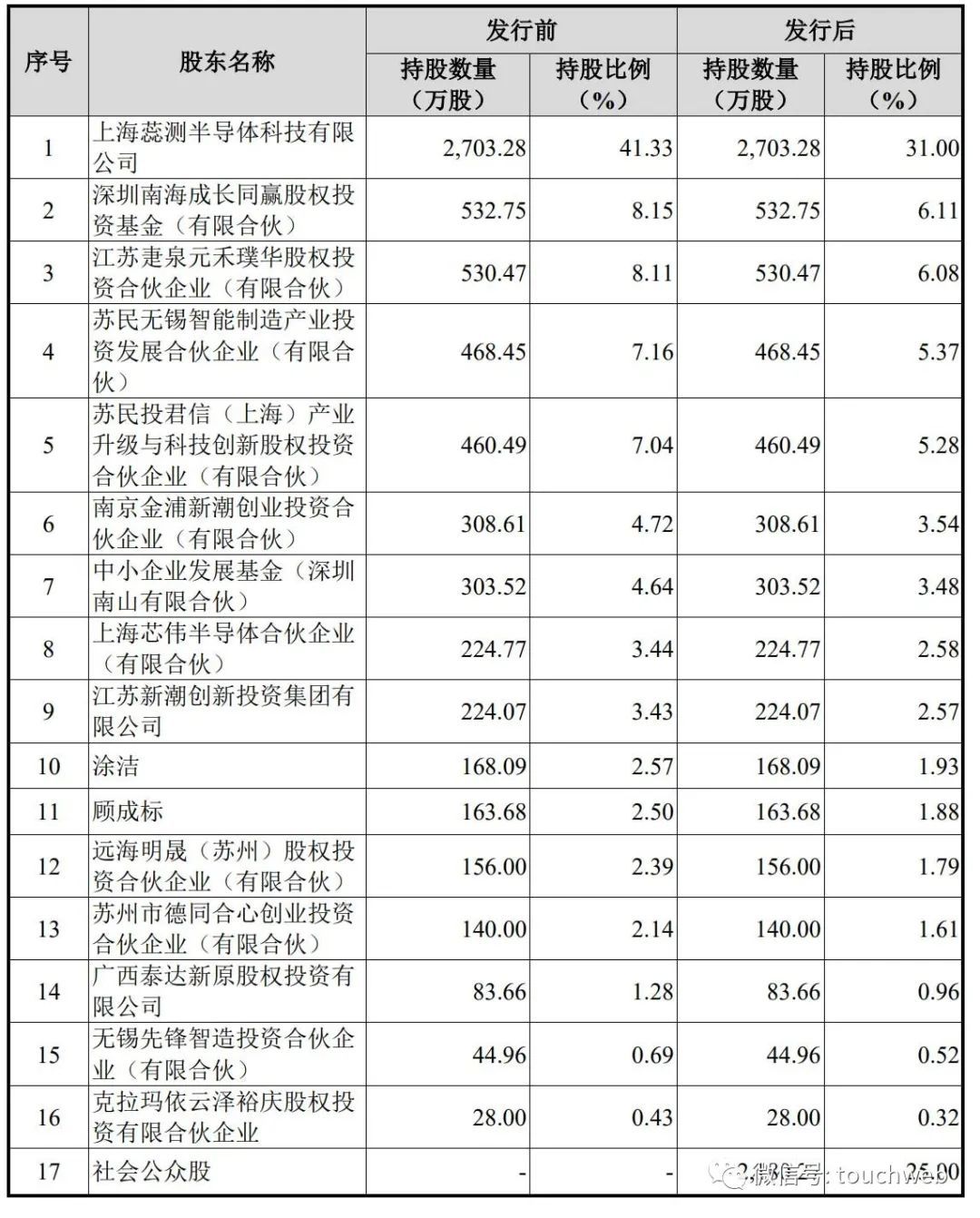 IPO后,上海蕊测半导体科技有限公司持股31%,深圳南海成长同赢股权投资基金(有限合伙)持股6.11%,江苏疌泉元禾璞华股权投资合伙企业(有限合伙)持股6.08%,苏民无锡智能制造产业投资发展合伙企业持股为5.37%;