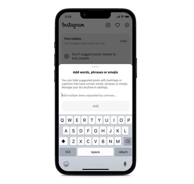 Instagram将允许用户从建议的帖子中对特定的单词和表情符号进行屏蔽。Instagram