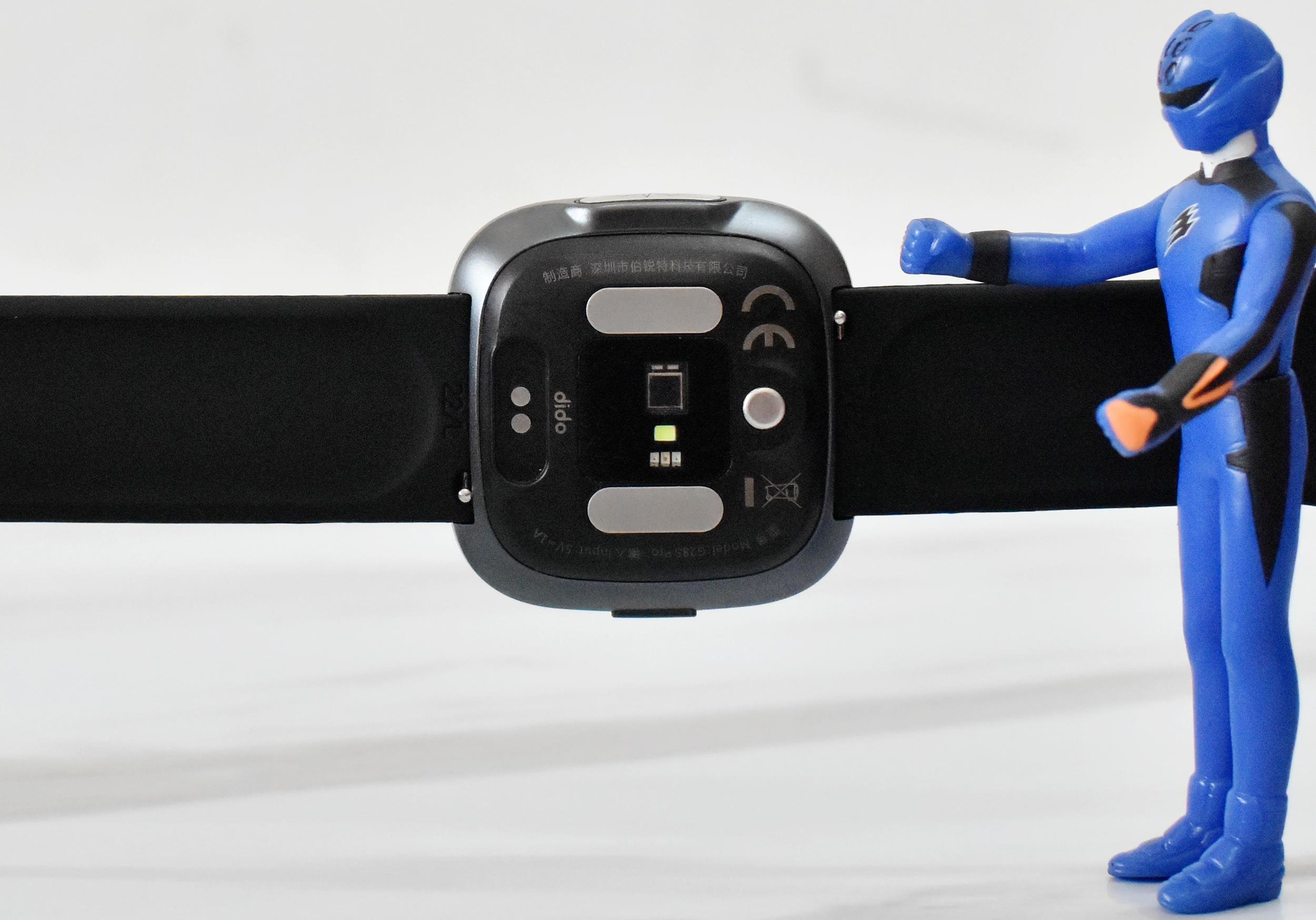 dido G28心电血压智能手表的背部也是采用舒适贴合手腕的弧形设计,各种感应测量传感器都分布在手表的背面,上面还印有产品的名称及参数。ECG心电图检测时用的电极框位于机身右侧,也是非常符合我们平常使用习惯的。