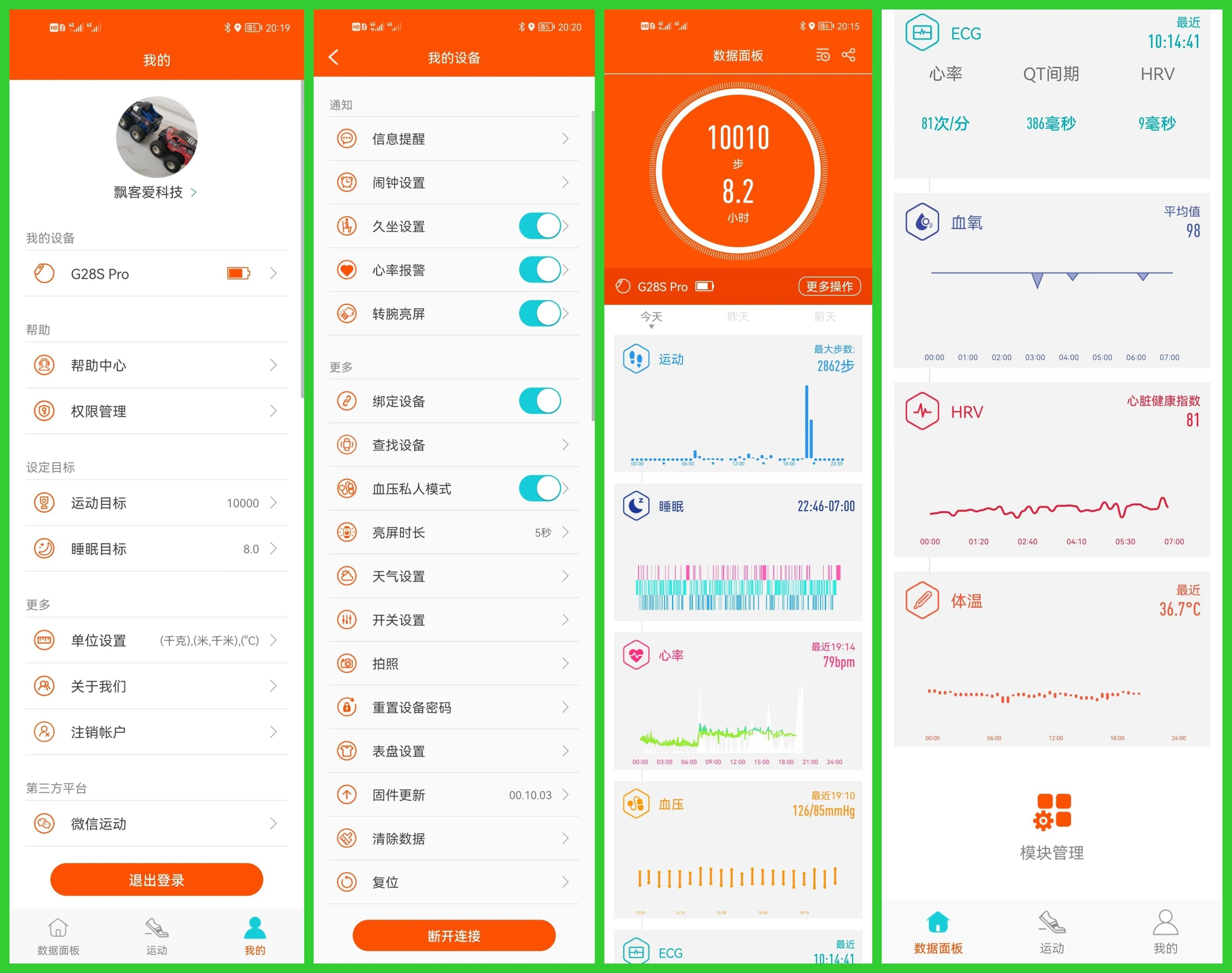 在APP上可以看到包括设备管理、使用帮助以及设定目标等完整的软件配套,其中包含了手表上可操作的丰富功能,另外通过数据面板我们可以清晰了解运动、睡眠、心率、血压、血氧、HRV、ECG以及体温等形成的大数据分析,能够更好更清晰帮助我们了解和关注自身的健康情况。