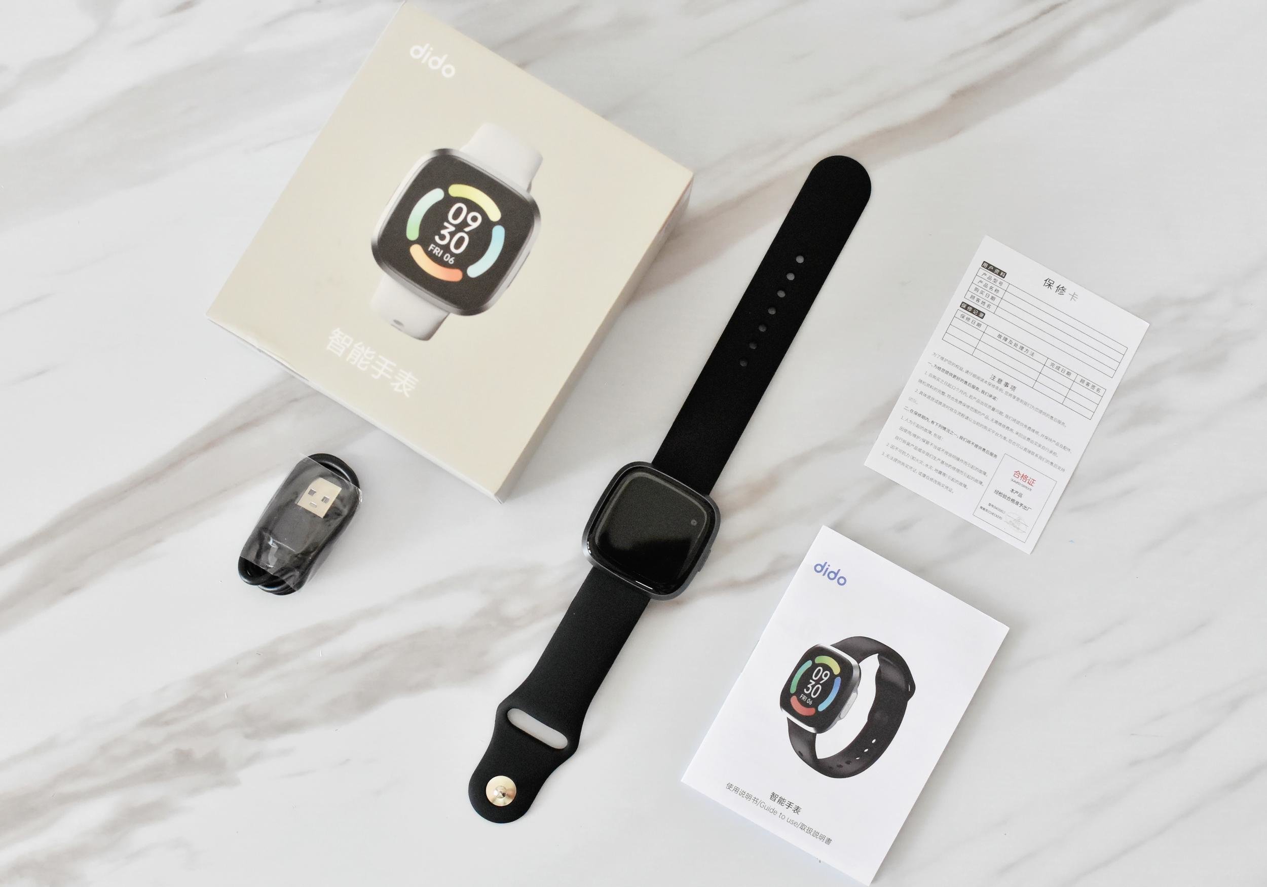 外包装是个彩色的正方形盒子,在顶盖上印有产品图片和LOGO,从渲染的图片看与苹果手表相似度蛮高,当然实际上也是非常有档次和质感的。迫不及待开启包装,手表有很好的保护固定在内盒中,旁边有一个小盒子包装的附件,包装清单包含dido G28 心电血压智能手表、磁吸式充电线和说明书、保修卡。