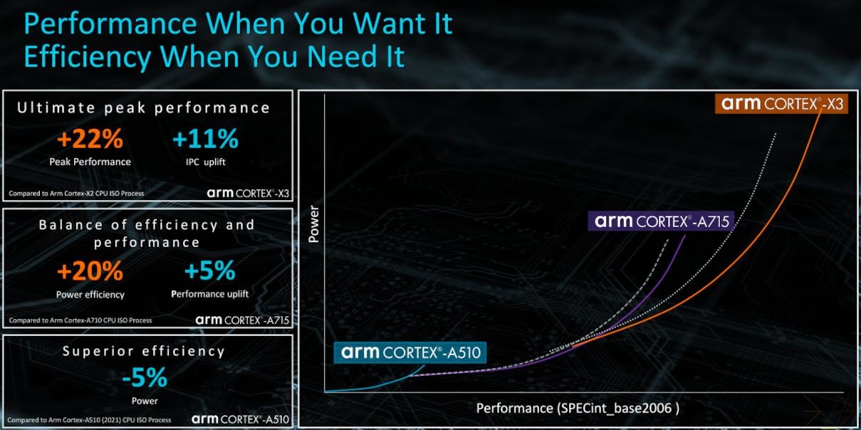 我们知道,CPU实际性能表现我们可以依照使用场景的不同,以单线程和多线程来划分差异。其中CPU单线程性能主要是依赖于大核心的表现。骁龙8Gen2所搭载的超级大核将会是ARM最新的Cortex X3,根据ARM此前公布的数据显示,X3相较X2,其IPC同频理论性能提升了11%。