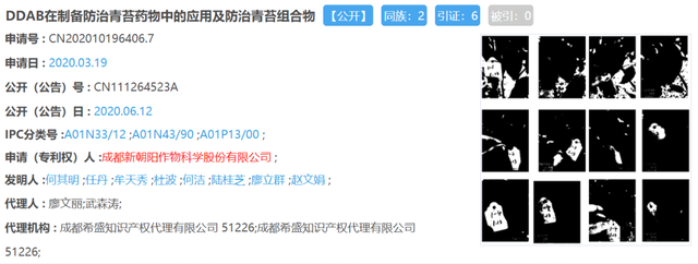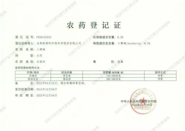 2022年4月24日,成都新朝阳作物科学股份有限公司0.5%小檗碱水剂获得新增扩登柑橘青苔病的登记(登记证号:PD20152433)。至此,新朝阳小檗碱成为首个正式登记防治青苔的生物农药。