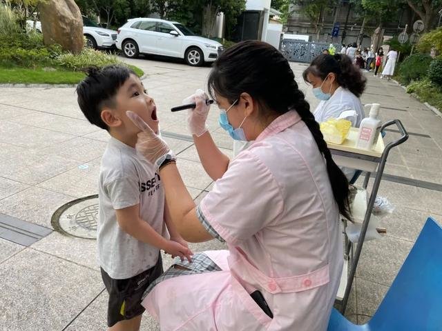图说:杨浦区本溪路幼儿园的保健老师,在为孩子们做晨检