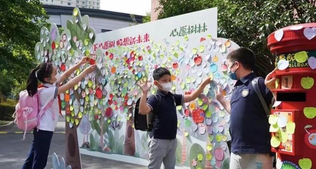 早上走进黄浦区教育学院附属中山学校的美丽校园,学生惊喜地发现,首先映入眼帘的是一大片茂盛的“树林”,原来这是学校特意装点的“心愿树林”。大家在小小的“爱心”卡、“苹果”卡上,书写下自己的新学期心愿,订立小目标,畅想新期待。“心愿树林”上,有孩子们想要品尝的美食、想去旅游的景点,也有想学会的才艺、想参加的“330”课程、想报考的学校……
