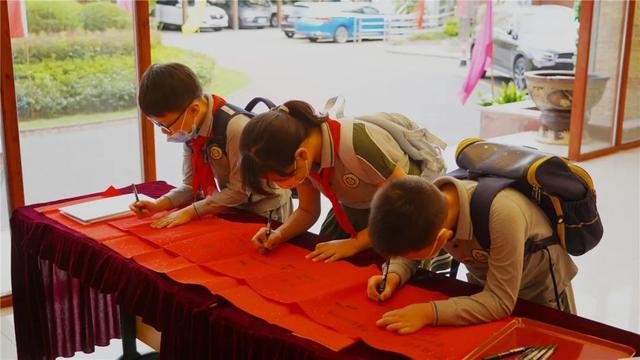踏入校园大厅,同学们效仿古人行“开笔礼”,在红色的卷轴上写下自己的新学期目标,寓意新学期开笔添智。行好“开笔礼”,同学们排着整齐的队伍,一一击鼓明志,鼓声越响,声音传得越远,寄寓的志向就越远大。