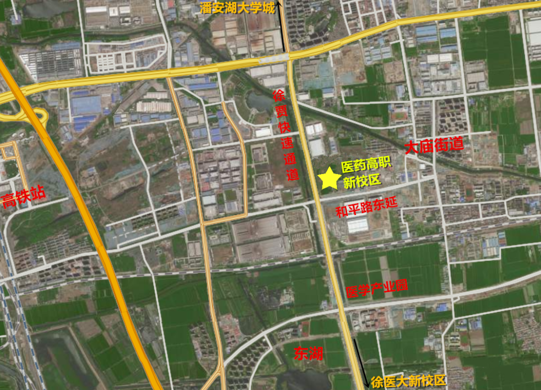 根据规划,徐州医药高等职业学校新校区建设项目位于经开区徐贾快速路以东、和平路东延段以北,东侧和北侧为规划道路。