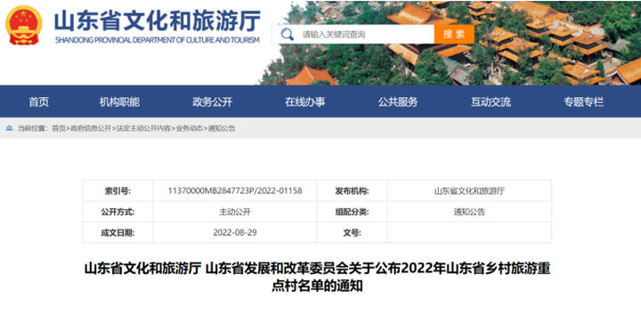 8月29日,山东省文化和旅游厅、山东省发展和改革委员会发布《关于公布2022年山东省乡村旅游重点村名单的通知》。