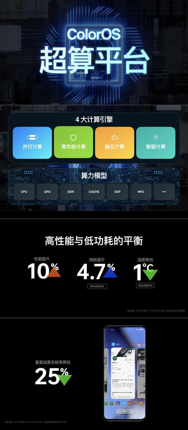 至于大家更关注的性能优化问题,会上也给出了解答。ColorOS超算平台通过算力模型对硬件计算资源的精准调度,结合并行计算、高性能计算、端云计算、智能计算4大计算引擎,通过算力模型和并行计算,重点解决计算资源分配不合理、内存使用冲突的两个业界难题。根据 OPPO实验室的测试,升级到 ColorOS 13的 Find X5 Pro,整机性能提升 10%,在《王者荣耀》测试中,能够做到高帧率稳定,性能无损失,且续航提升 4.7%,同时将游戏最高温度降低了 1°C。