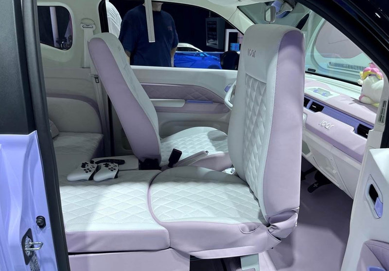 QQ冰淇淋Kid Space的副驾座椅倒坐,与后排座椅拼接成一个沙发榻,并有独立的小桌子,可以更好地照顾副驾的儿童。
