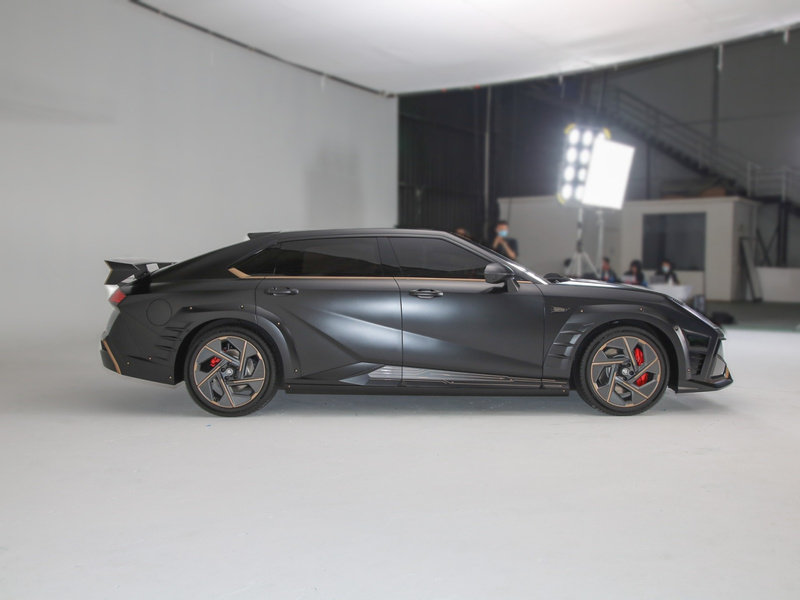 机甲龙重装概念版,外观涂装采用了全新的亚光黑配色,并通过金色装饰进行点缀,同时车头前方增加了额外的装饰性组件,尾部也加上了运动尾翼,搭配造型夸张的后包围造型,视觉上带来更强烈的运动气质。