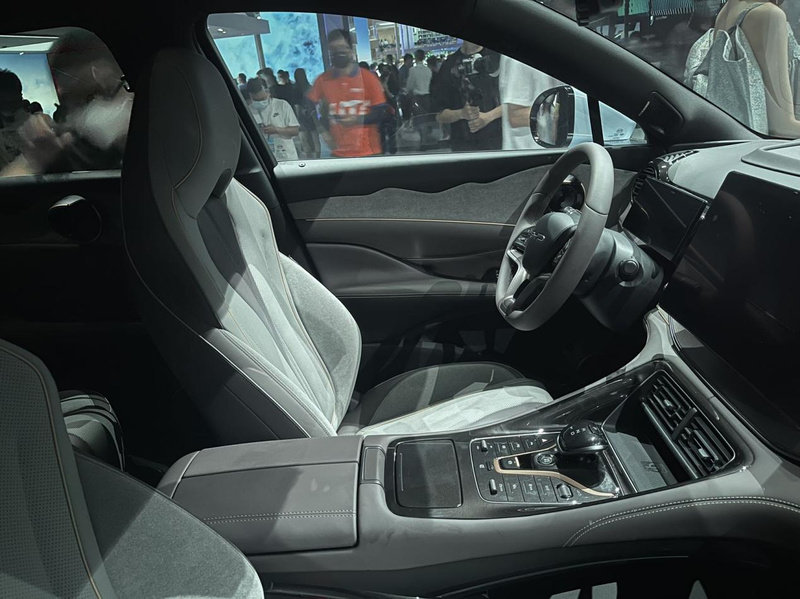 内饰布局沿用了比亚迪军舰系列的设计,并加入更多海洋元素,譬如海浪般的空调出风口。可旋转的悬浮中控屏也没有缺席,主驾前方配备HUD头显,还有双拼面料座椅、丹拿音响等等。